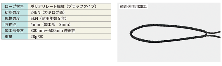 材料にポリアリレート繊維を使用しており、寸法安定性・耐摩耗性・耐切創性を兼ね備えた高い強度の繊維ロープを実現しました。